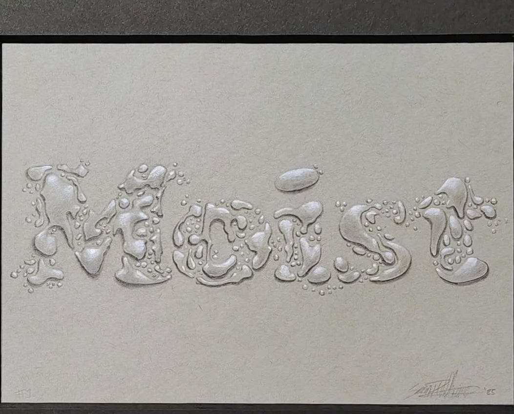 An original 5"x7" pencil & white charcoal drawing of everyone's favorite word to hate, Moist!