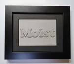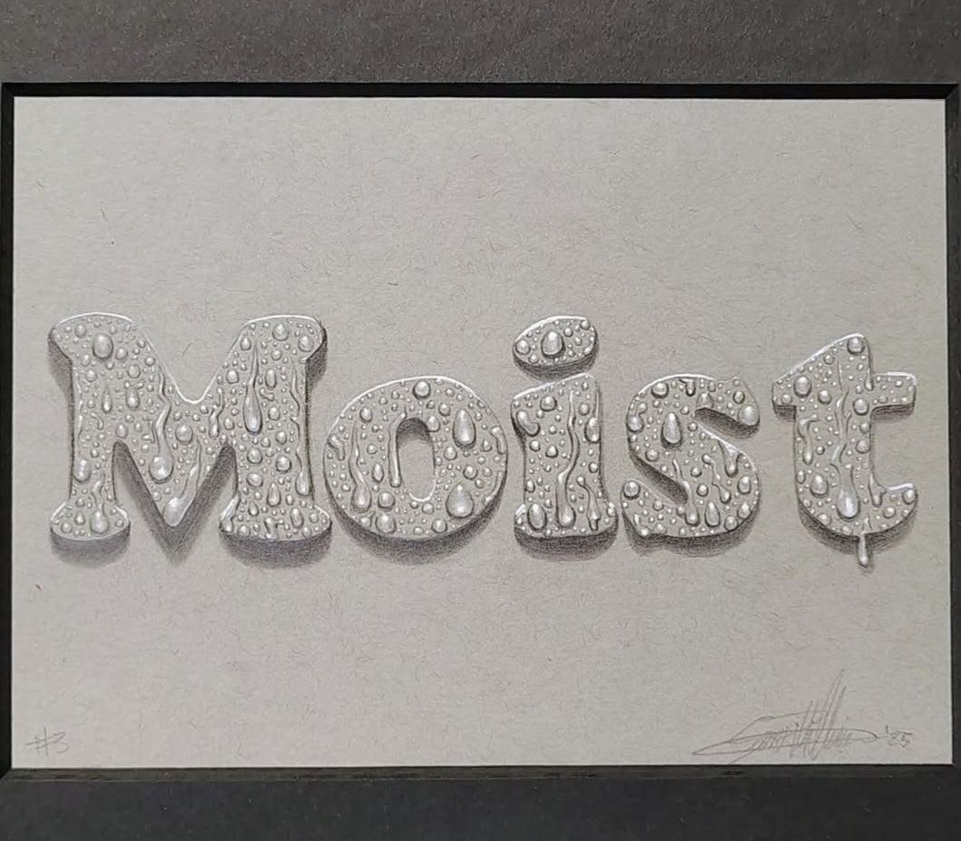 An original 5"x7" pencil & white charcoal drawing of everyone's favorite word to hate, Moist!